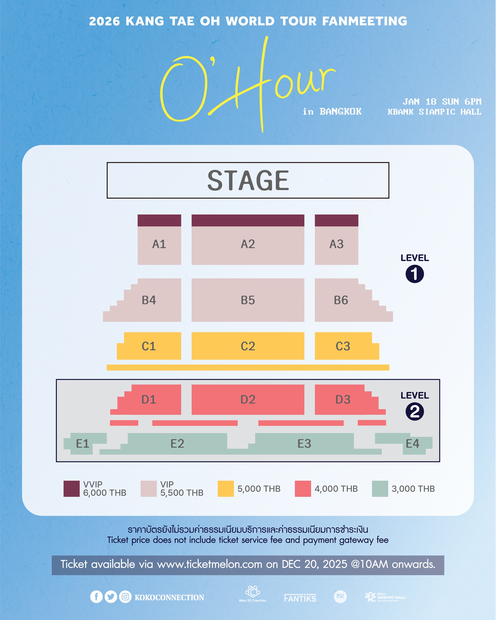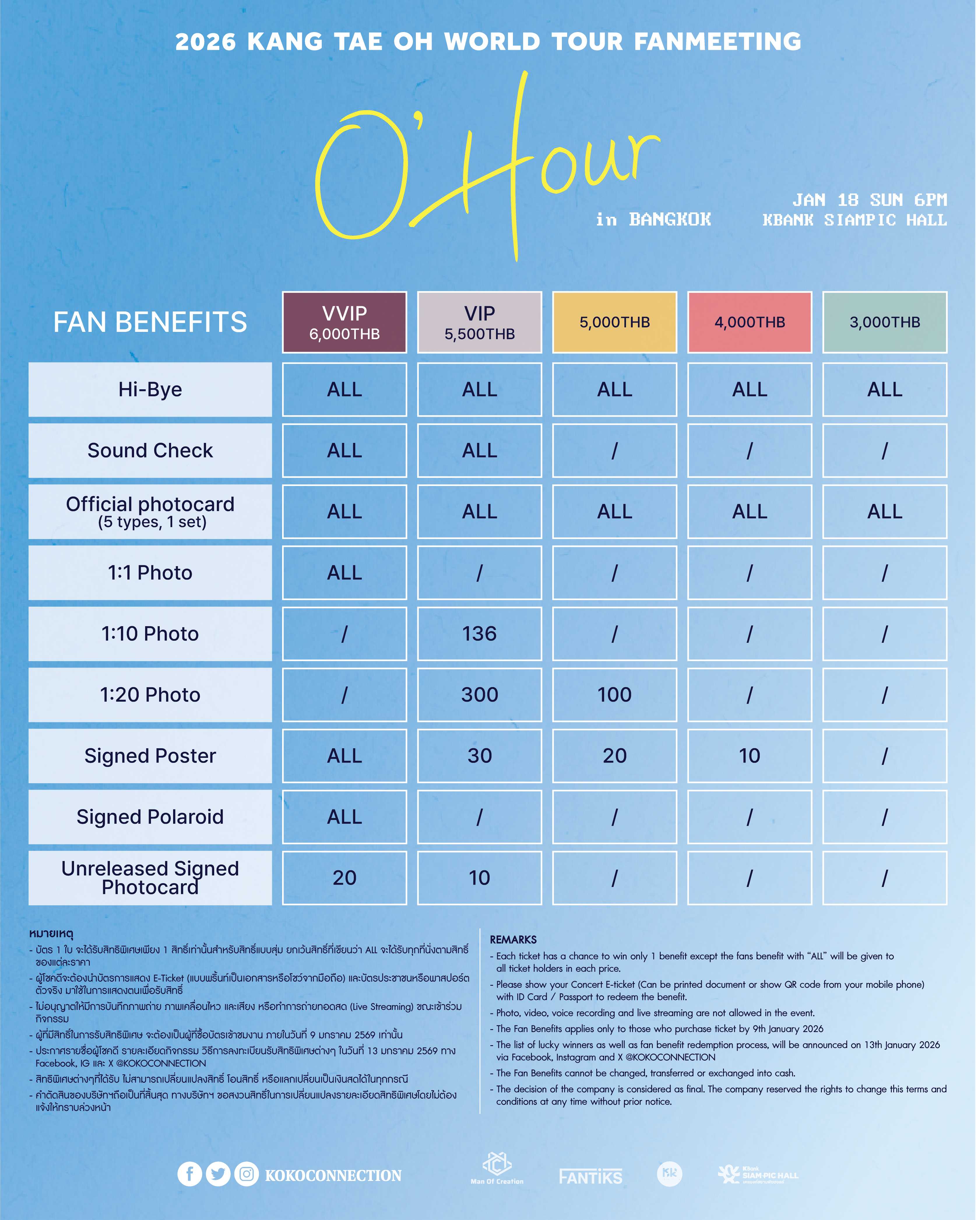 ความอบอุ่นพร้อมส่งตรงพร้อมเสิร์ฟขนาดนี้ บอกได้คำเดียวว่าห้ามพลาด! มาร่วมสร้างความทรงจำสุดหล่อ เอ๊ย! ความทรงจำสุดแสนพิเศษ ในช่วงเวลาต้องมนต์กับ O’Hour ของพระเอกหนุ่ม “คัง แทโอ” ไปด้วยกัน ในวันอาทิตย์ที่ 18 มกราคม 2569 กับงาน <2026 KANG TAE OH WORLD TOUR FANMEETING <O’Hour> in BANGKOK> กาปฏิทินให้แม่น กดบัตรพร้อมกัน ในวันเสาร์ที่ 20 ธันวาคม 2568 เวลา 10.00 น. ผ่านทาง WWW.TICKETMELON.COM บัตรราคา 6,000/5,500/5,000/4,000 และ 3,000 บาท ที่มาพร้อมสิทธิพิเศษ ได้เข้าร่วมกิจกรรม Hi-bye กับหนุ่ม “คัง แทโอ” ทุกที่นั่ง แล้วมาสบตาเสพย์ความหล่อละมุนพร้อมรอยยิ้มละลายใจของ “คัง แทโอ” ไปด้วยกัน ติดตามรายละเอียดดังกล่าว พร้อมทั้งข่าวสารอื่นๆ ได้ทางช่องทางโซเชียลมีเดีย FB: www.facebook.com/KOKOConnection / X:https://x.com/KOKOConnection / IG:https://www.instagram.com/kokoconnection