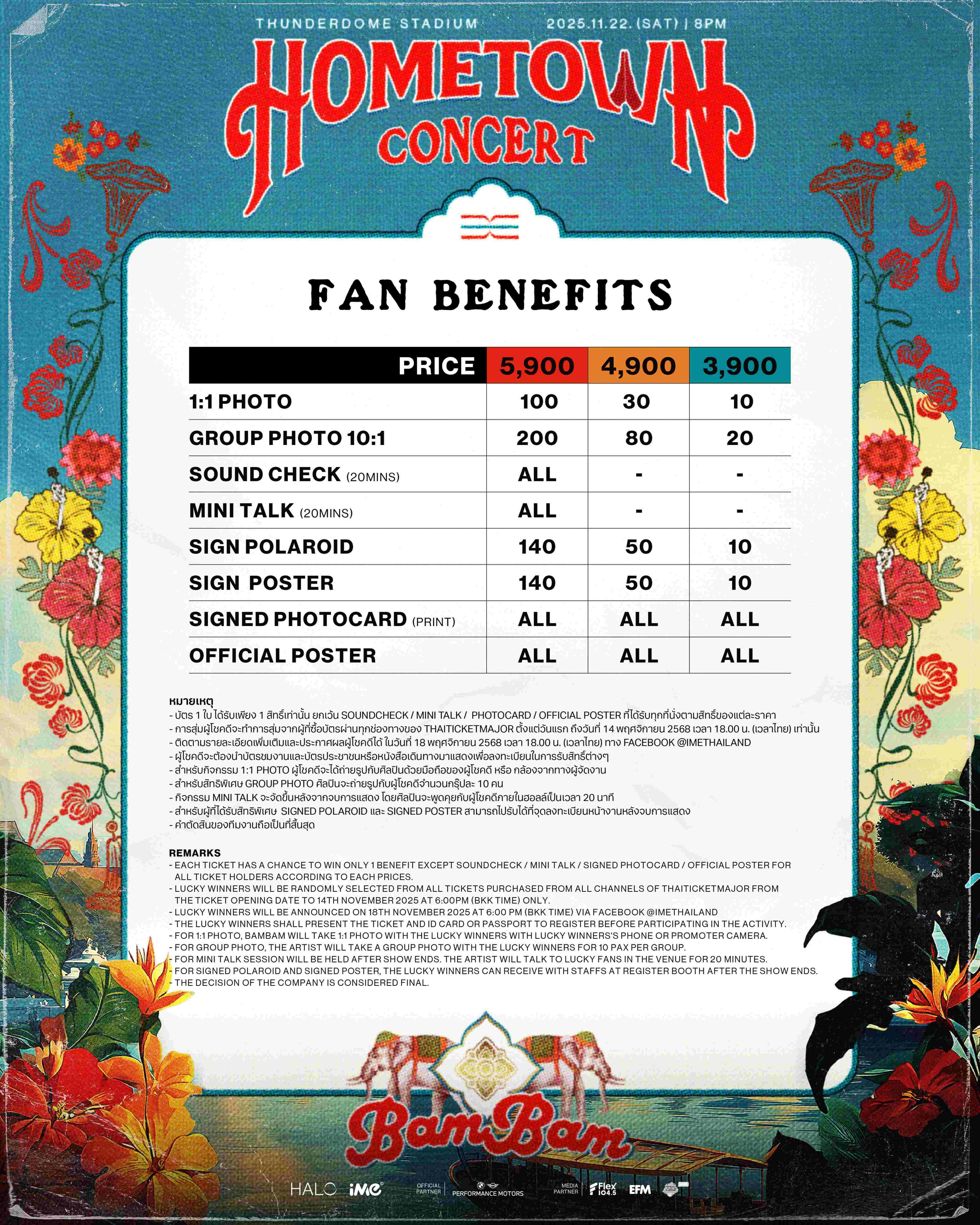 ความปังของ “แบมแบม” ไม่มีคำว่าถอย มีแต่พุ่งขึ้นเรื่อยๆ และในคอนเสิร์ตใหญ่ครั้งนี้เจ้าตัวก็ทุ่มเทสุดหัวใจ เพื่อมอบโชว์ที่ดีที่สุดให้กับแฟนๆ ในบ้านเกิดที่เขารักที่สุด “HOMETOWN” ที่มีความทรงจำ ความผูกพัน และผู้คนที่รักแบมแบมอย่างล้นหลาม! แฟนคลับห้ามพลาดมาเป็นส่วนหนึ่งของ “2025 BamBam HOMETOWN Concert in Bangkok” เพราะอะไรที่คุณคิดว่าอาจจะไม่มี อาจจะมีมากกว่าที่คิด! อะไรที่คิดว่าจะไม่ได้เห็น เตรียมเห็นแบบจัดเต็ม! และเซอร์ไพรส์ที่ไม่คาดคิด อาจจะเกิดขึ้นเฉพาะที่นี่..ที่เดียวเท่านั้น!!