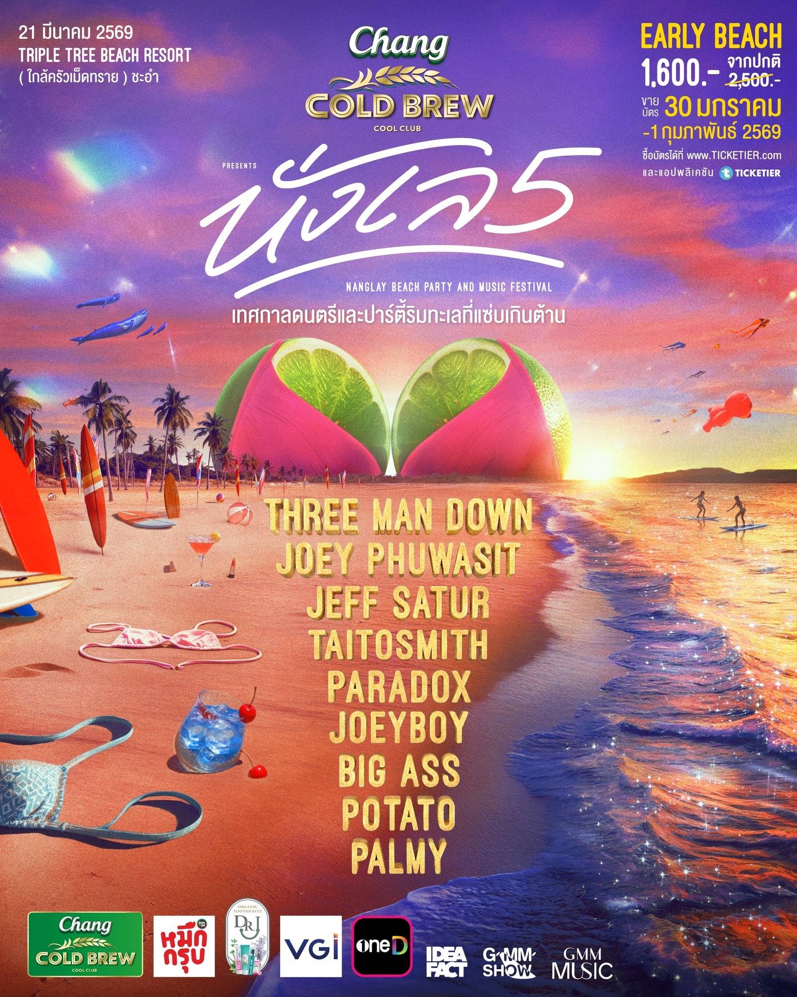 GMM SHOW ผู้จัดงานคอนเสิร์ตและเฟสติวัลชั้นนำของประเทศไทย ประกาศความพร้อมในการจัดงาน Chang Cold Brew Cool Club Presents “นั่งเล 5” เทศกาลดนตรีและปาร์ตี้ริมทะเลที่แซ่บเกินต้าน ที่ยืนหนึ่งคอนเซ็ปต์ “ซัมเมอร์แรกที่แซ่บที่สุด” ซึ่งจะจัดขึ้นในวันเสาร์ที่ 21 มีนาคม 2569 ณ TRIPLE TREE BEACH RESORT อำเภอ ชะอำ จังหวัด เพชรบุรี ในปีนี้ถูกออกแบบให้ได้รับประสบการณ์แบบ HYBRID SPACE ซึ่งเป็นการผสมผสานไลฟ์สไตล์ทางทะเลให้เข้ากับบรรยากาศปาร์ตี้ได้อย่างลงตัว เพื่อสร้างสรรค์ประสบการณ์ที่มากกว่าการชมคอนเสิร์ต และตอบโจทย์ทั้งสายชิลปล่อยจอยและสายปาร์ตี้ปล่อยสุดได้อย่างเต็มอิ่มครบทุกมิติ