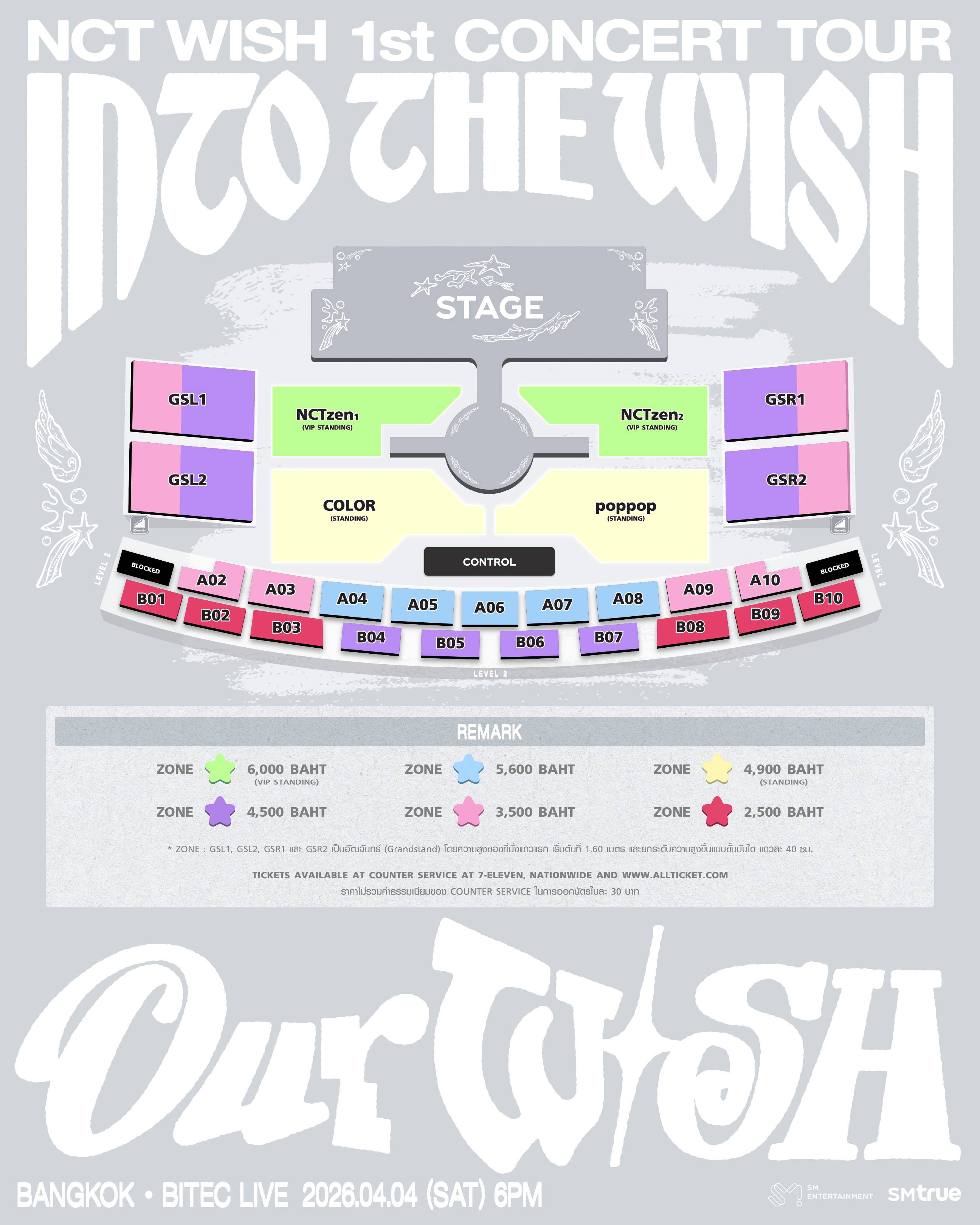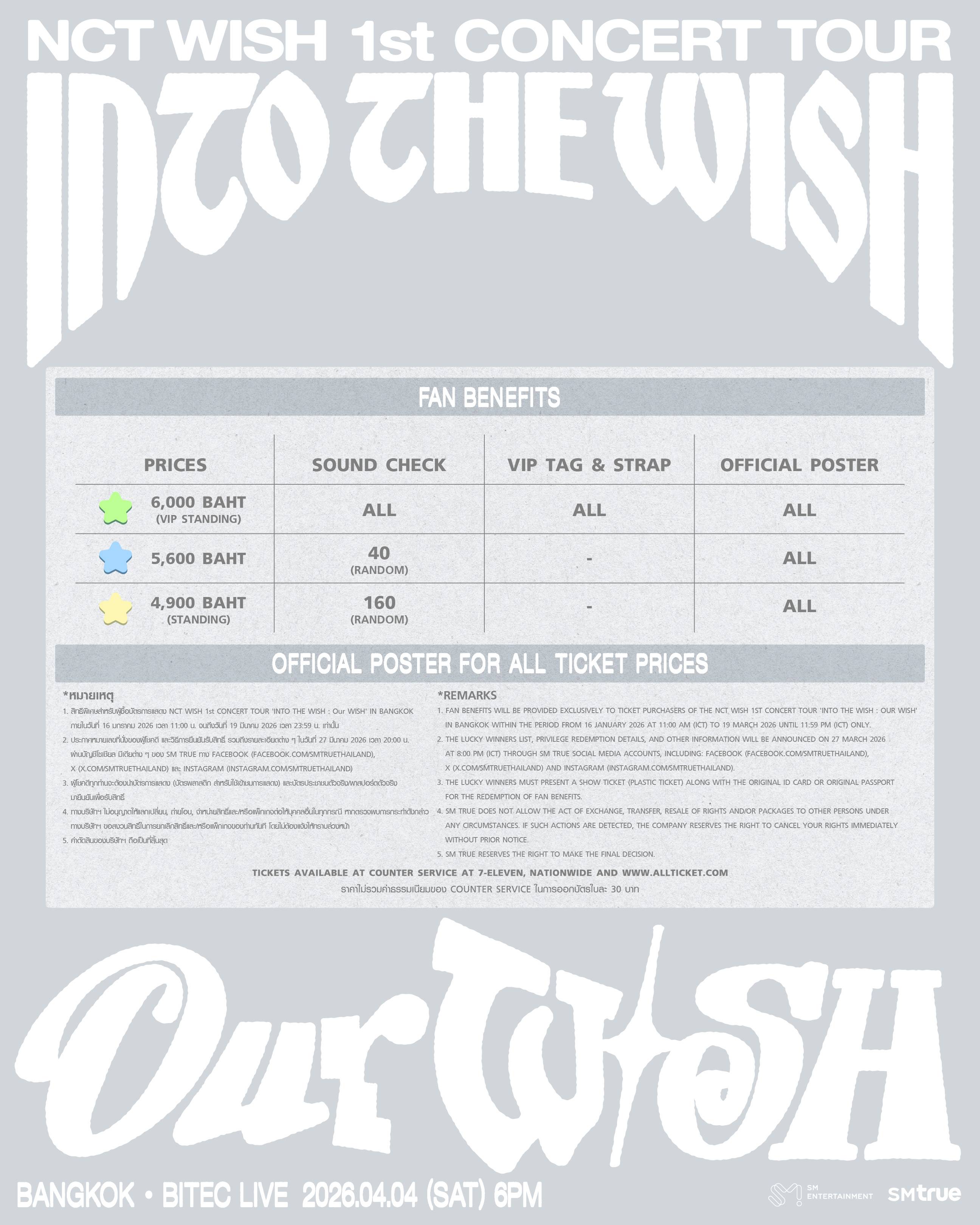 เตรียมตัวให้พร้อม แล้วมาร่วมออกเดินทางไปกับ NCT WISH (เอ็นซีที วิช) เพื่อเติมเต็ม “Our WISH” ให้กลายเป็นความจริงไปด้วยกันใน NCT WISH 1st CONCERT TOUR ‘INTO THE WISH : Our WISH’ IN BANGKOK เปิดจำหน่ายบัตรรอบสมาชิก “NCTzen WISH” Membership (GL) Pre-Sale ในวันศุกร์ที่ 16 มกราคม 2026 เวลา 11:00 น. – 20:59 น. เท่านั้น และรอบบุคคลทั่วไป (General Sale) ในวันอาทิตย์ที่ 18 มกราคม 2026 ตั้งแต่เวลา 11:00 น. เป็นต้นไป ทางเคาน์เตอร์เซอร์วิสในร้าน 7-Eleven ทุกสาขาทั่วประเทศ และทางเว็บไซต์ www.allticket.com/event/NCTWISH_OurWISH_BANGKOK บัตรราคา 6,000 (VIP PACKAGE บัตรยืน) / 5,600 / 4,900 (บัตรยืน) / 4,500 / 3,500 / 2,500 บาท ติดตามข่าวสารและรายละเอียดเพิ่มเติมได้ทางบัญชีโซเชียลมีเดียต่าง ๆ ของ SM True : Facebook (เฟซบุ๊ก) facebook.com/smtruethailand, Instagram (อินสตาแกรม) instagram.com/smtruethailand, X (เอ็กซ์) x.com/SMTrueThailand และ TikTok (ติ๊กต๊อก) tiktok.com/@smtruethailand สอบถามข้อมูลเพิ่มเติมเกี่ยวกับการซื้อบัตรได้ทาง Counter Service : อีเมล support@allticket.com และไลน์ออฟฟิเชียล @counterservice