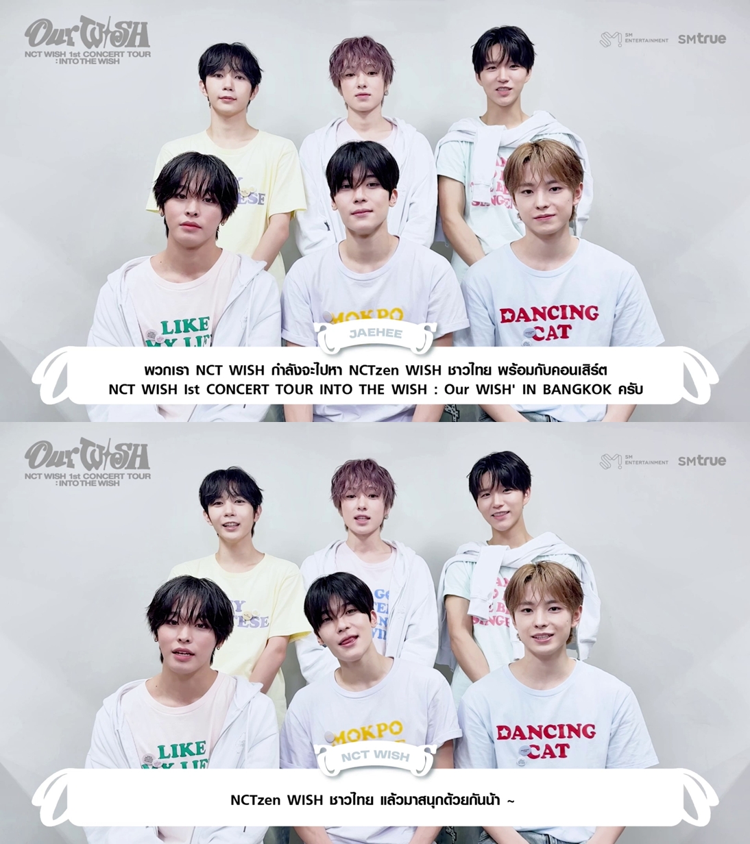 ไม่เพียงเท่านี้ พวกเขายังได้ส่งคลิปทักทายถึงแฟน ๆ ชาวไทย พร้อมเผยความคิดถึงและความประทับใจในเสียงเชียร์อันทรงพลัง ตลอดจนการตั้งตารอที่จะได้ร่วมกันสร้างความทรงจำที่ไม่มีวันลืมอีกครั้งบนเวทีคอนเสิร์ตครั้งนี้ ดังนี้“To The World, here is NCT! สวัสดีครับ พวกเรา NCT WISH ครับ ทุกคนคิดถึง “น้องวิช” (NCT WISH) ไหมครับ พวกเรากำลังจะไปหา NCTzen WISH ชาวไทย พร้อมกับคอนเสิร์ต NCT WISH 1st CONCERT TOUR ‘INTO THE WISH : Our WISH’ IN BANGKOK ครับ NCTzen WISH ชาวไทย พร้อมออกเดินทางครั้งใหม่ไปกับพวกเราหรือยังครับ สำหรับคอนเสิร์ตครั้งนี้จะจัดขึ้นในวันที่ 4 เมษายน 2026 ณ BITEC LIVE ครับ พวกเราจำได้ว่า เสียงเชียร์และพลังของ NCTzen WISH ชาวไทยสุดยอดมาก ๆ เลยครับ ครั้งนี้ก็จะสร้างความทรงจำที่ไม่มีวันลืมให้กับพวกเราอีกใช่ไหมครับ พวกเรากำลังเตรียมตัวอย่างเต็มที่เพื่อตอบแทนความรักของ NCTzen WISH ครับ เพราะฉะนั้น ช่วยตั้งตารอกันด้วยนะครับ NCTzen WISH ชาวไทย แล้วมาสนุกด้วยกันนะ”